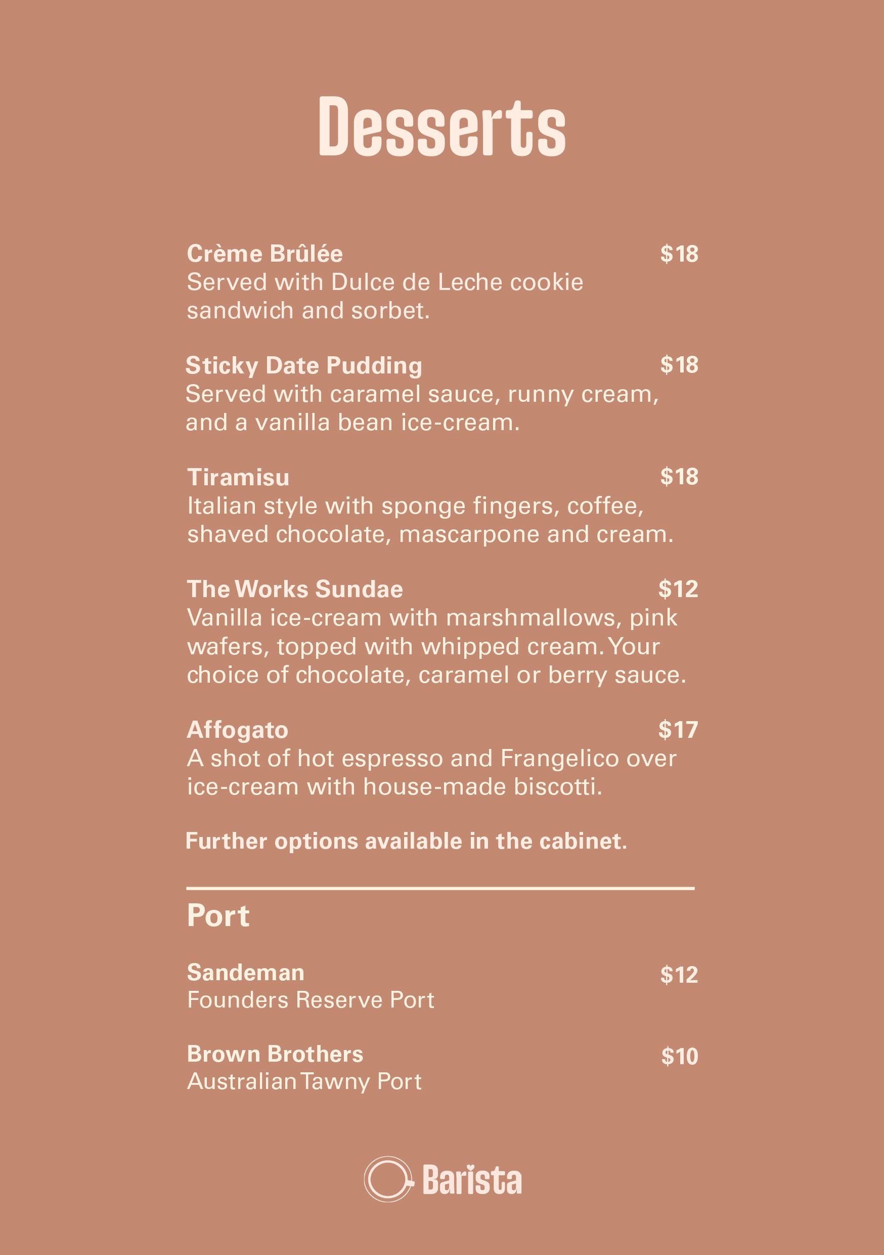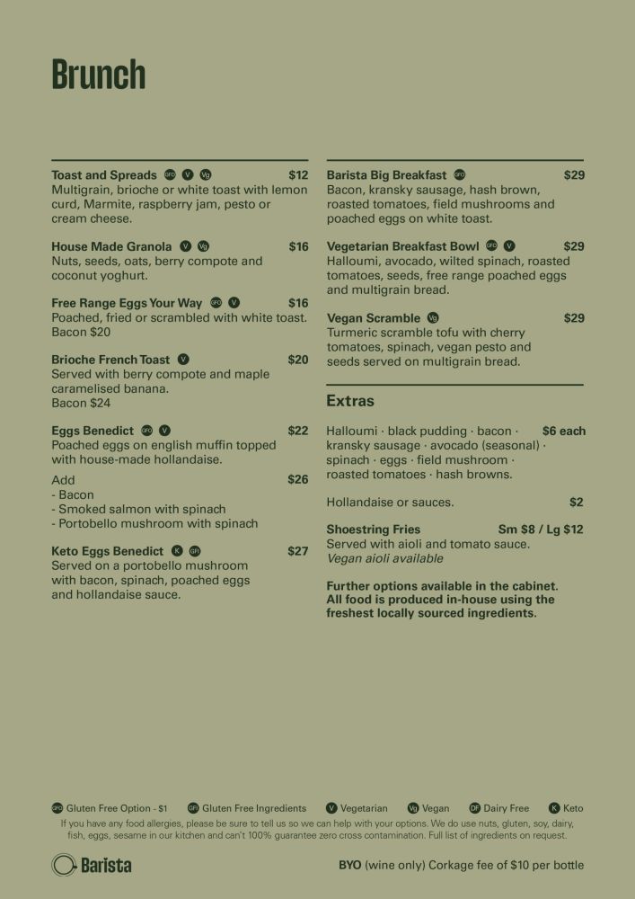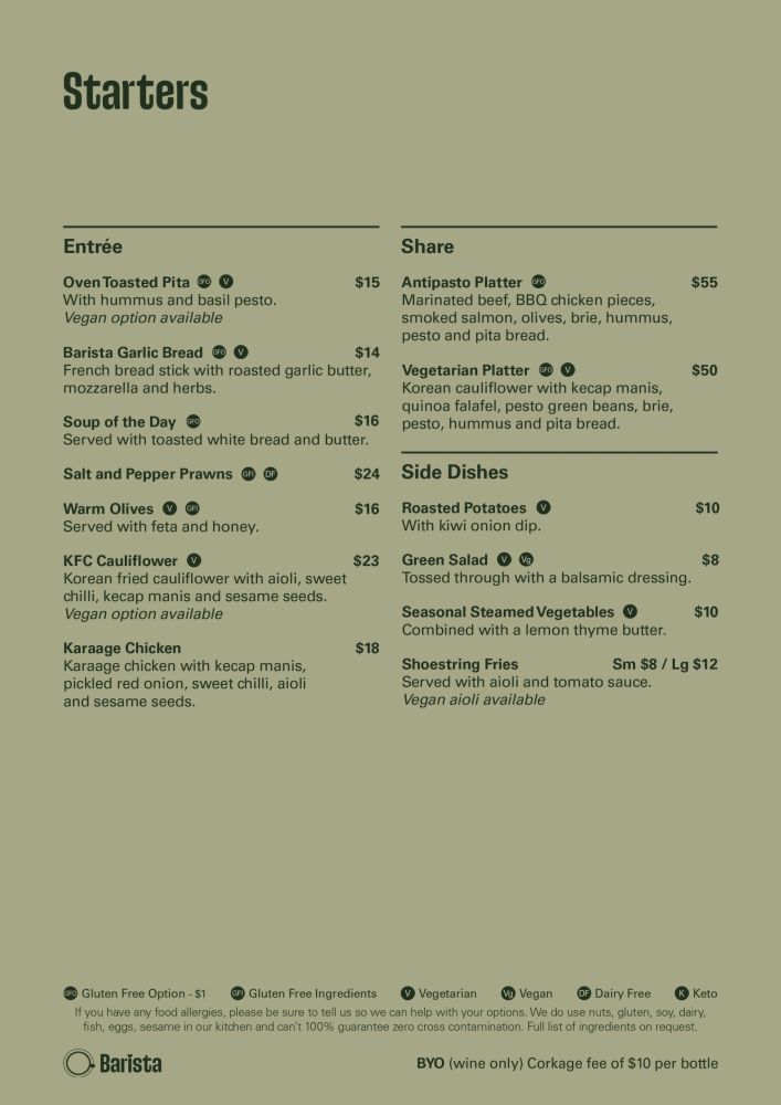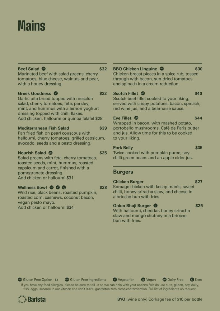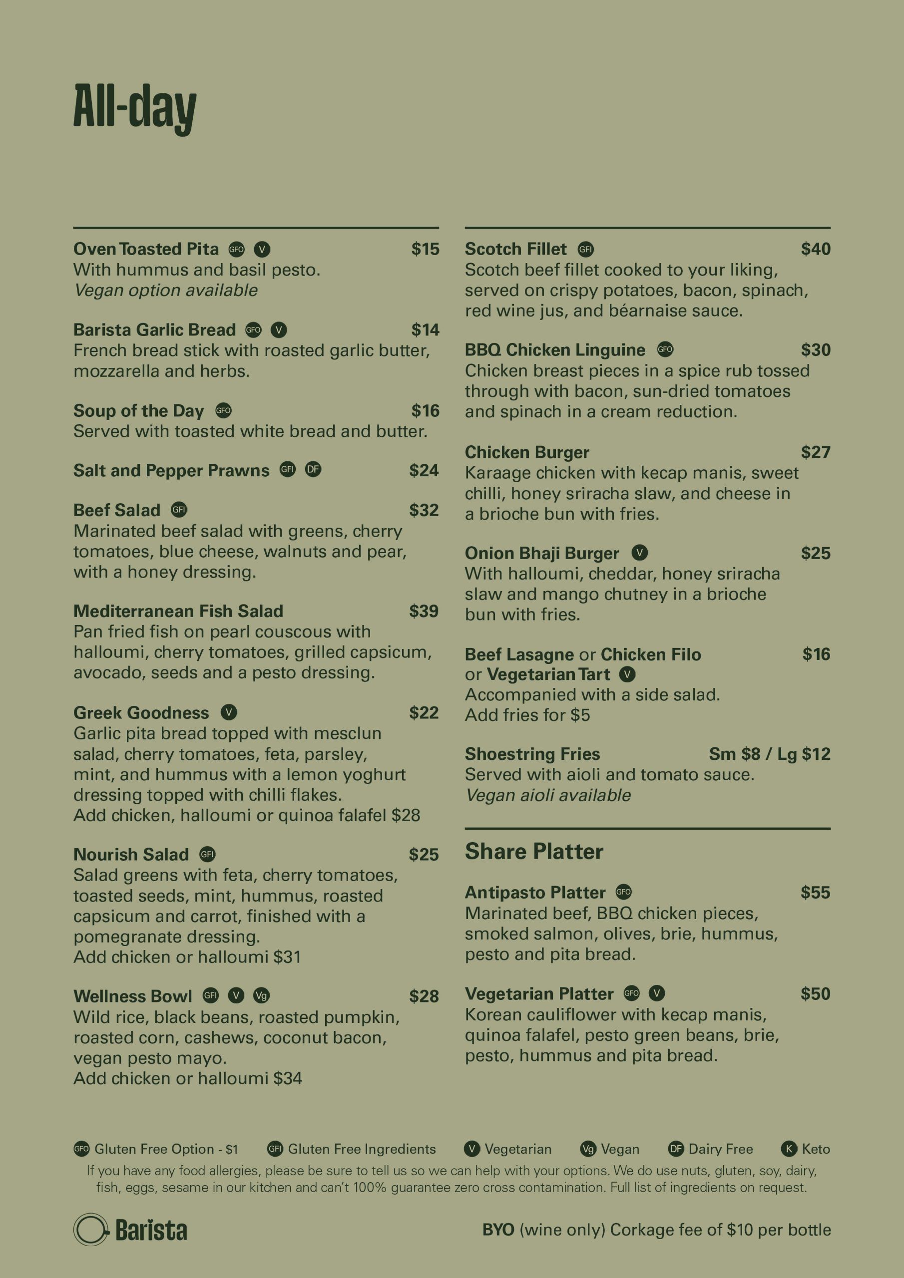 Explore Barista’s menus, featuring all-day, dinner, and dessert options with plenty of vegan and gluten-free choices—something for everyone.
