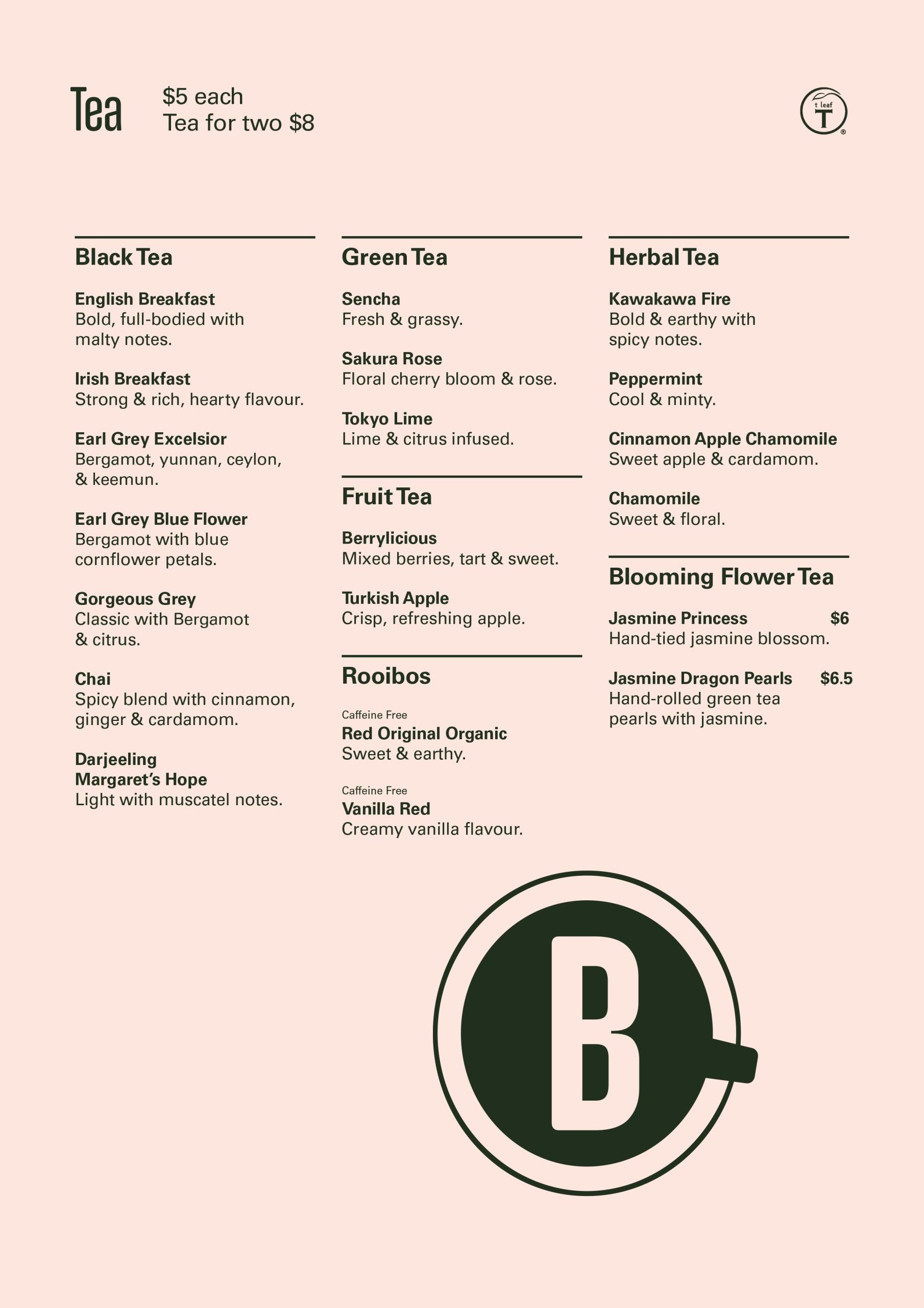 We proudly serve L’affare coffee and t Leaf T, two premium New Zealand brands known for quality and flavour.