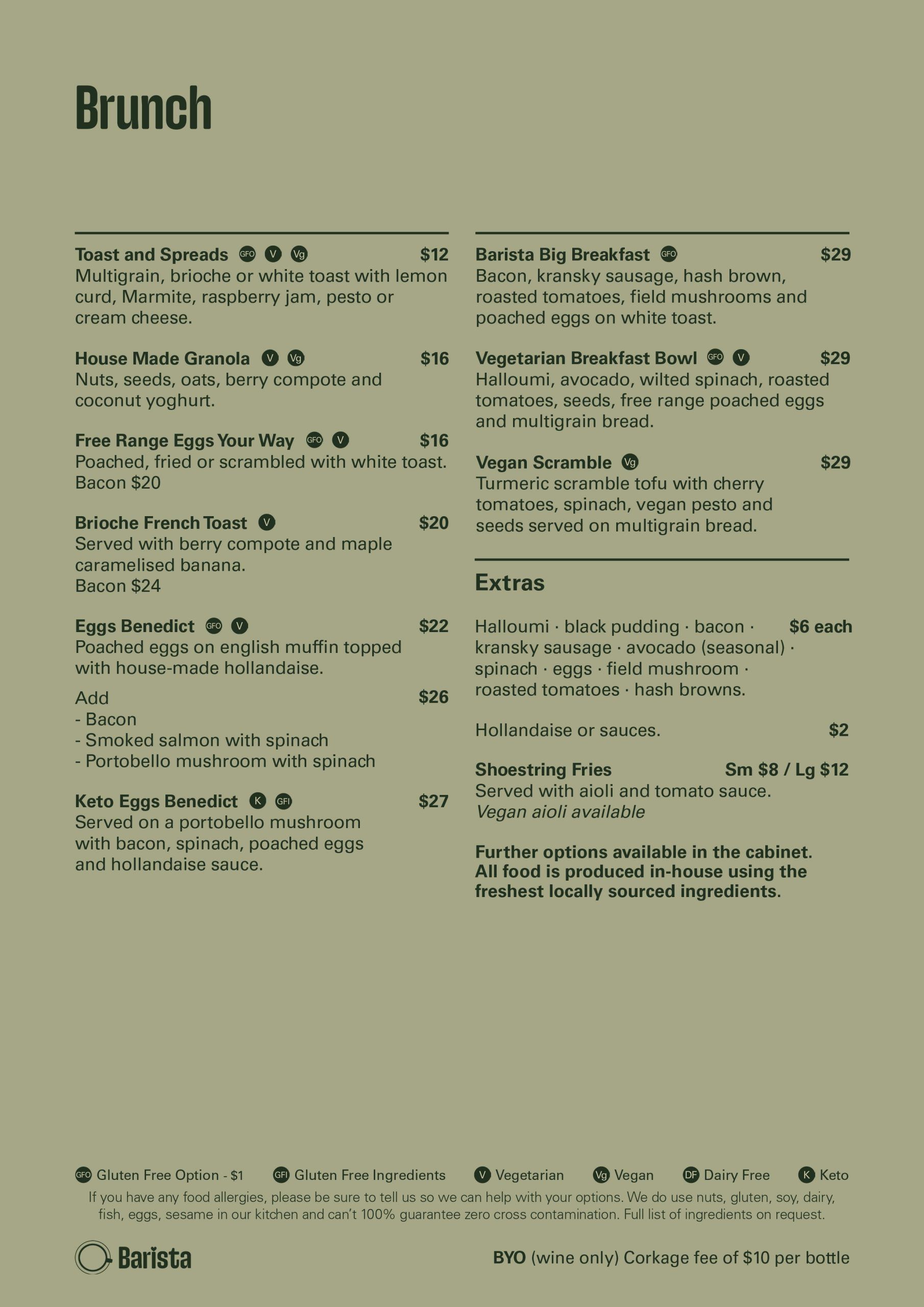 Explore Barista’s all-day menus, from hearty breakfasts to dinner and dessert, with plenty of vegan and gluten-free options. Start your day with eggs benedict, toasties, or nourishing bowls.